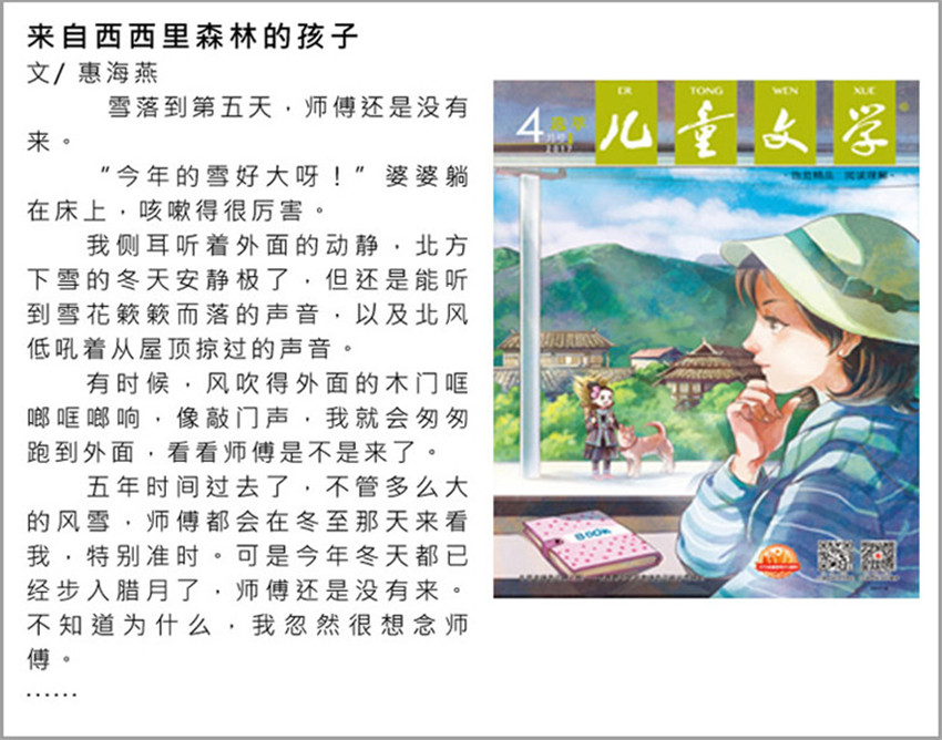 收到書的第一反應便是迫不及待的打開看。當我看到《兒童文學》時,我激動的幾乎落淚。仍記得我的學生時代,我愛上的第一本雜志便是《兒童文學》,在那些貧困的日子里,我的語文老師給我的《兒童文學》被我視為我最大的財富。現在再見到它,就像是多年不見的老朋友,使我感到很親切。