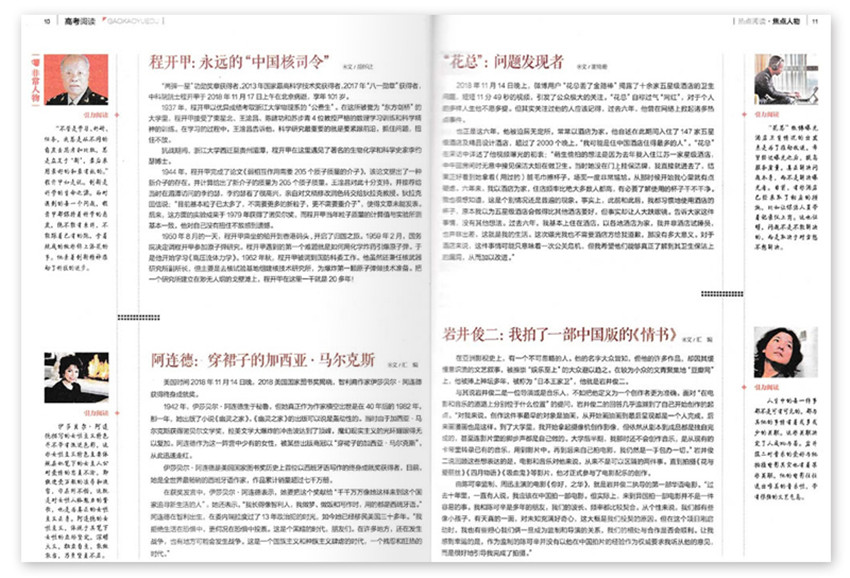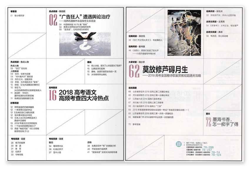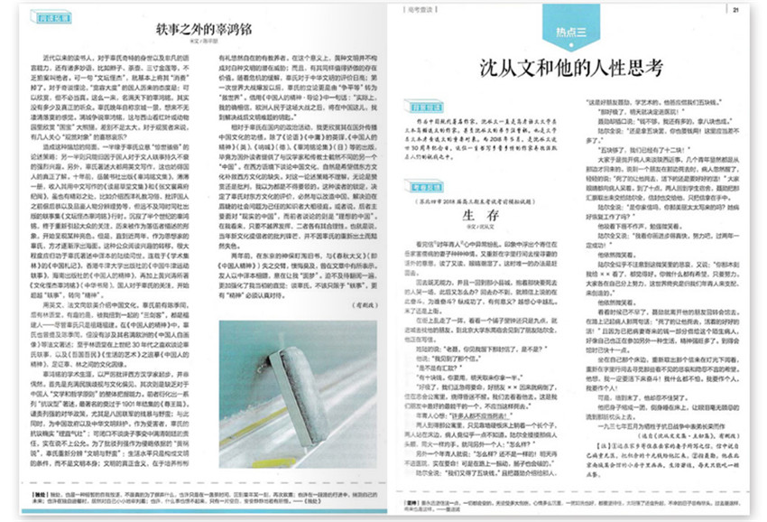 《高考閱讀》雜志主要是運(yùn)用熱點(diǎn)時(shí)事和熱點(diǎn)人物的材料進(jìn)行命題,匯集了最新的熱點(diǎn)事件和熱點(diǎn)人物,能夠?qū)⒆钚碌臒狳c(diǎn)材料一網(wǎng)打盡,幫助學(xué)生全面學(xué)習(xí)和運(yùn)用熱點(diǎn)材料;第三個(gè)部分對經(jīng)典的小說、散文閱讀的命題,匯集精選歷代名作、名家作品進(jìn)行命題;第四部分則是一線名師根據(jù)名家名作的押題。
