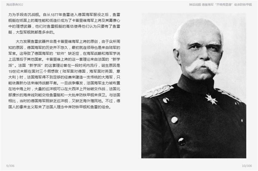 大力發展魚雷武器并非是卡普里維海軍上將的原創,由于眾所周知的原因,德國海軍的歷史并不悠久,初就連領導也是來自陸軍的軍官。這導致了德國海軍的”軟件”缺乏癥,在海軍戰略和海軍學說上遠落后于其他國家??ㄆ绽锞S上將的這一套理論來自法國的“新學派"法國“新學派”的這套理論曾在一段時間內流行,誕生原因是19世紀末期在面對三個假想敵(陸軍面對德國,海軍面對英國、意大利)時,法國海軍得不到足夠的經費來建造一支傳統的大海軍,只能依靠新辦法來維持戰略平衡。一旦戰爭爆發,法國海軍主力被布置。