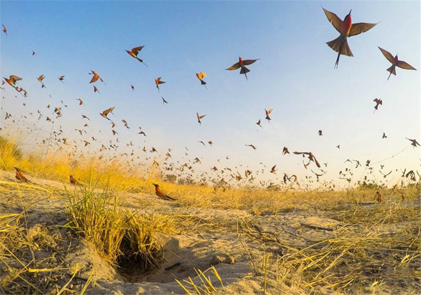 在納米比亞的贊比西河,無(wú)以計(jì)數(shù)的深紅色的食蜂鳥(niǎo)(南紅蜂虎)沖上藍(lán)天。你來(lái)掌鏡攝影師JasonBoswell說(shuō):“”當(dāng)時(shí)一組人正想為幾百只食蜂鳥(niǎo)做標(biāo)記,以了解它們離開(kāi)這片土壤后去了哪里。為了躲避人群,鳥(niǎo)兒紛紛起飛,所以才有了這一幕?!苯裉焓敲绹?guó)國(guó)家愛(ài)鳥(niǎo)節(jié),這個(gè)節(jié)日正好碰上一個(gè)由市民為了觀察統(tǒng)計(jì)國(guó)內(nèi)鳥(niǎo)類(lèi)健康狀況而發(fā)起的項(xiàng)目——圣誕節(jié)鳥(niǎo)類(lèi)數(shù)量統(tǒng)計(jì)。