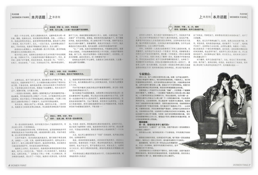 通過處在世紀(jì)之交的現(xiàn)代女性心靈路程的揭示和成長(zhǎng)經(jīng)歷的記錄,以及與她們所思所想所憂所喜的溝通和交融,描繪出了當(dāng)今女性真切的生存狀態(tài)、多維的生活方式和追求,以清新活潑的文風(fēng),犀利獨(dú)到的目光,精致大方的裝幀,水乳交融的文圖吸引著人們,成為都市知識(shí)女性白領(lǐng)麗人的精神享受,成為年輕女孩及大學(xué)生的良師益友。