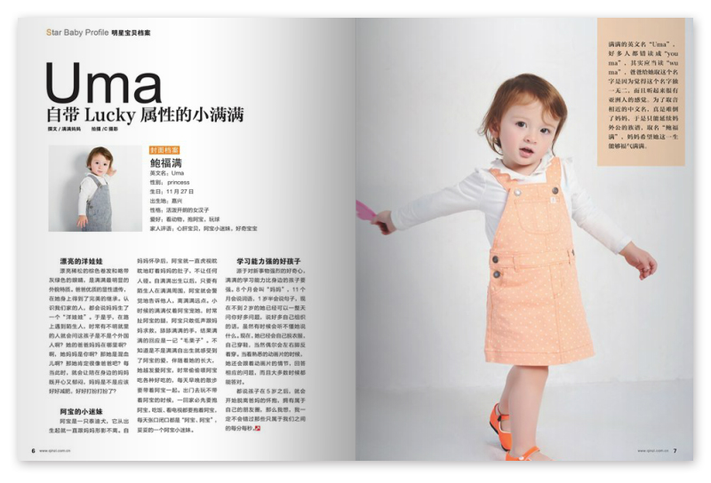 自帶Lucky屬性的小滿滿,封面檔案寶姓名:鮑福滿英文名:Uma性別:princess生日:2011年11月27日出生地:興性格:活潑開朗的女漢子愛好:看動(dòng)物,抱阿寶,玩球家人評(píng)語:心肝寶貝,阿寶小迷妹,奇寶寶滿滿的英文名"Uma”,好多人都錯(cuò)讀成"you ma”,其實(shí)應(yīng)當(dāng)讀"wuma”,爸爸給她取這個(gè)名字是因?yàn)橛X得這個(gè)名字獨(dú)一無二,而且聽起來很有亞洲人的感覺。