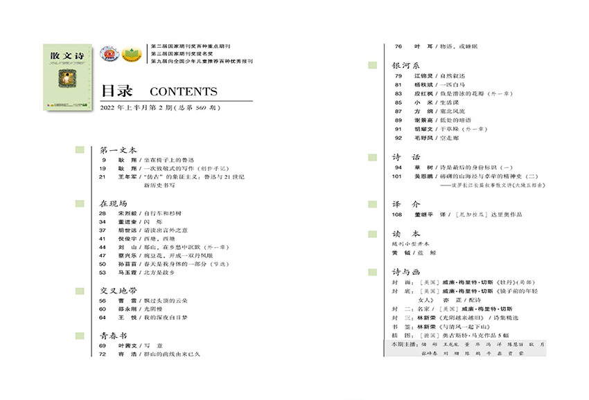 《散文詩》主要欄目:第一文本、在現(xiàn)場、銀河系、詩話、譯介、交叉地帶、青春書、讀本、詩與畫