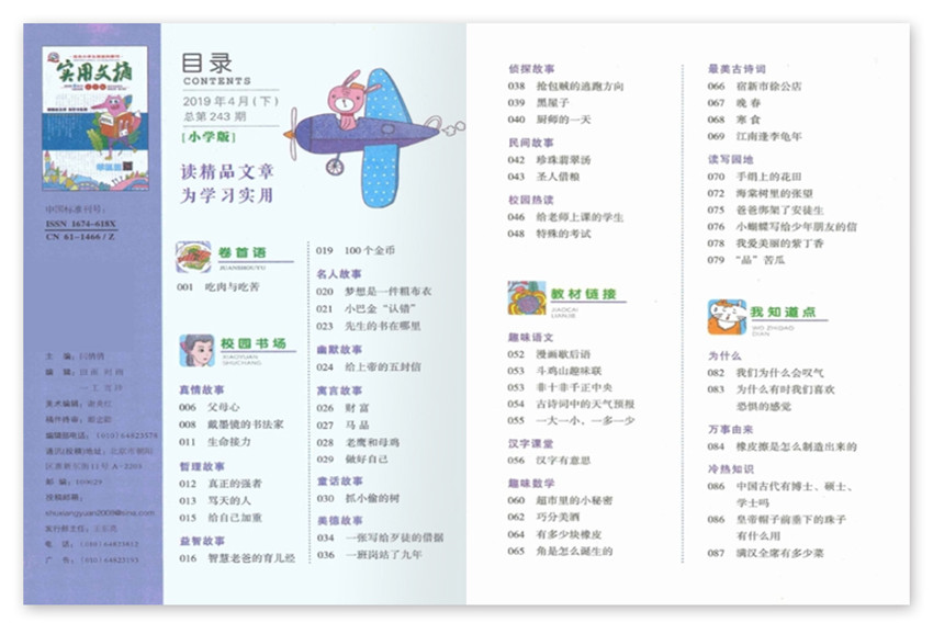 《實用文摘》真情故事、益智故事、名人故事、哲理故事、成長故事、幽默故事、童話故事、偵探故事、勵志故事、科幻故事、校園熱讀;趣味語文、課延知識、開心成語、讀寫園地;為什么、萬事由來、冷熱知識、文明禮儀、煉意志、健體格好心情等。