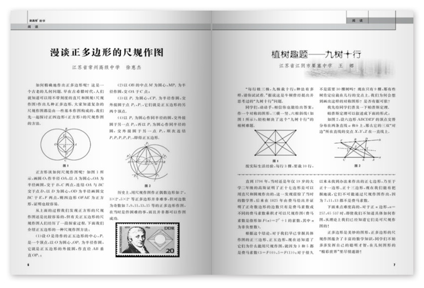 漫談正多邊形的尺規作圖,如何地作出正多邊形呢?這是一個古老的幾何問題.早在古希臘時代,人們就知道可以用不帶刻度的直尺和圓規(尺規作圖)作出幾種正多邊形.大家知道復雜的尺規作圖都是由一些基本作圖構成的,我們先一起探討正四邊形(正方形)的尺規作圖的方法,正方形該如何尺規作圖呢?如圖1所示,畫圓○,作半徑OA,以A為同心,OA為半徑畫圓,交于B,C兩點,連結OA與BC交于點D,以D為圓心,OD為半徑畫圓交BC于E,F兩點,則四邊形OFAE為正方形,證明也較容易。