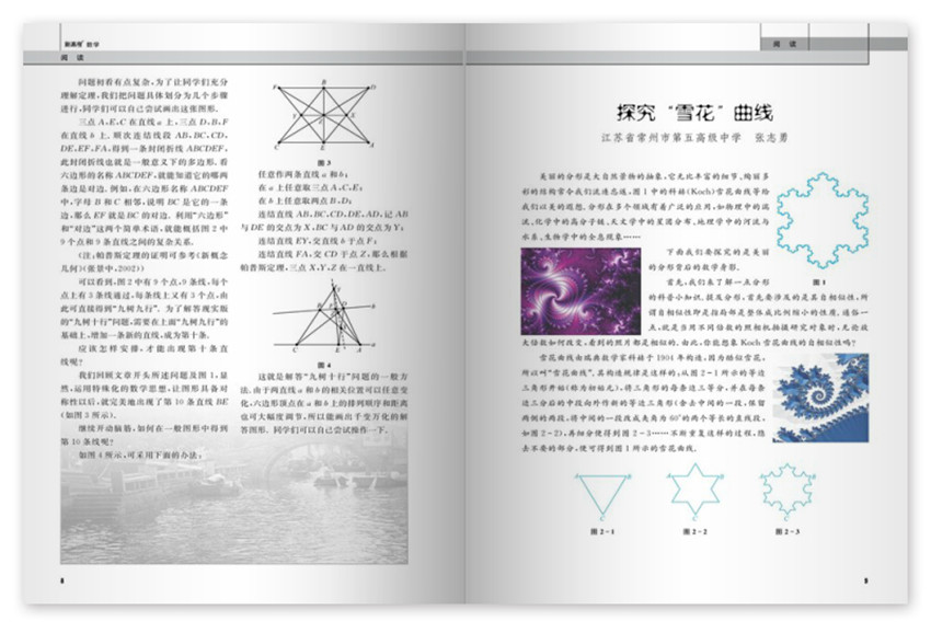 探究“雪花”曲線,美麗的分形是大自然景物的抽象,它無比豐富的細節、絢麗多彩的結構常令我們流連忘返,圖1中的科赫(Koch)雪花曲線等給我們以美的遐想,分形在多個領域有著廣泛的應用,如物理中的湍流、化學中的高分子鏈、天文學中的星團分布、地理學中的河流與水系、生物學中的全息現象……首先,我們來了解一點分形的科普小知識,提及分形,首先要涉及的是其自相似性,所謂自相似性即是指局部是整體成比例縮小的性質。