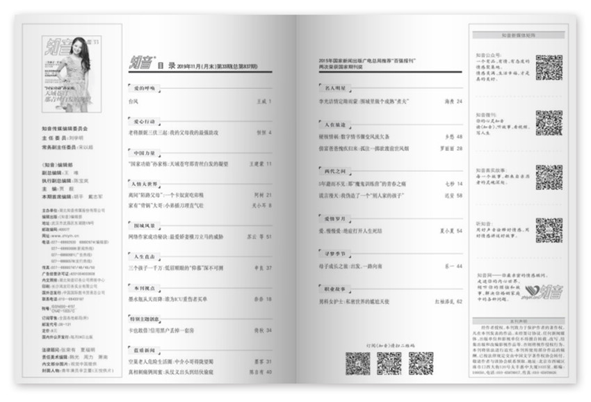 《知音》(半月刊)創(chuàng)刊于1985年,多年來雜志內(nèi)容及形式方面與時俱進(jìn),并以其形式和內(nèi)容的豐富性及多樣性,贏得了不同階層讀者的喜愛與擁護(hù)。
