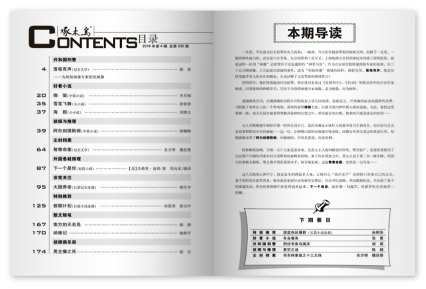 《啄木鳥》主要欄目:特別推薦、大案要案、好看小說、偵探與推理、塵封檔案、外國推理探索等。